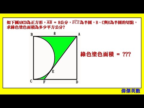 利用圓外一點到切點等距、畢氏定理、三角形面積、圓面積及正方形面積公式來解題 歡迎大家加入會員,贊助此影音頻道...